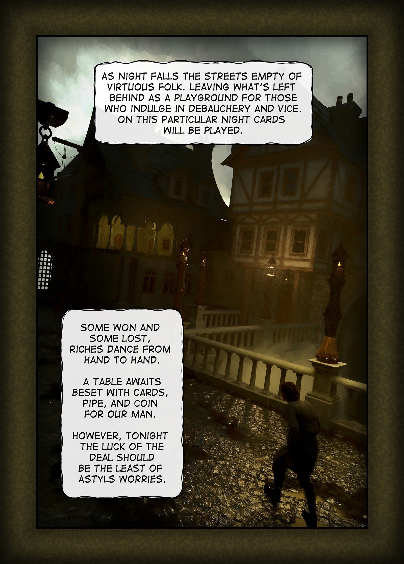 Eirgsmoth, whose port once thrived with diverse trade enriching noble houses befell a disaster as her waters receded mysteriously and the earth shook. Now surrounded in a quagmire the township rots from marsh beyond the walls as well as the corruption of a desperate once prosperous people. In despair, the denizens look to deities for solace or relief from noble houses, yet find madness in forgotten gods' cults and strife among the entitled have taken to fighting over the scraps of a decaying corpse. The corrupt are rewarded and the vicious make headway. Only the underworld flourishes. Eirgsmoth feeds upon her own children.